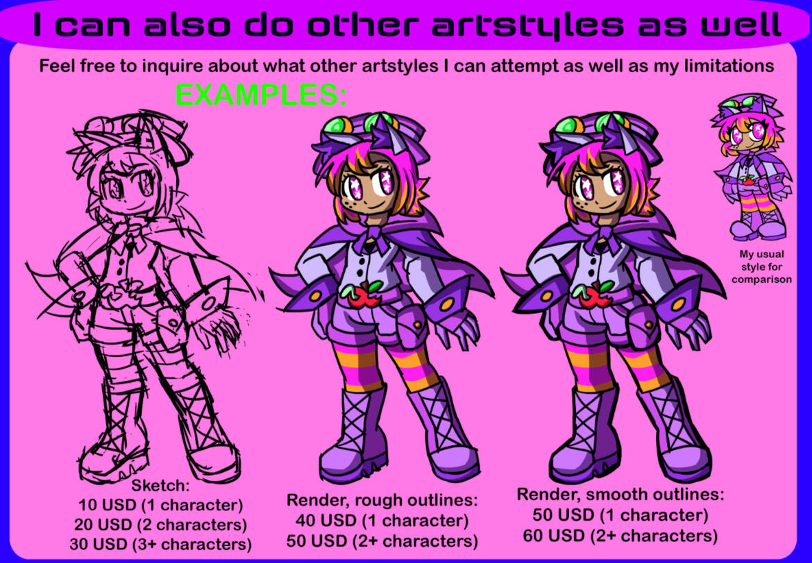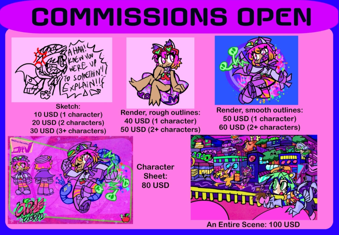 I'm a cartoon artist specializing in colorful designs with thick outlines, sharp edges and very, very, VERY cute characters. I look forward to working with all of you and I'm excited to bring your ideas into fruition in my signature artstyle and portray your characters in as well as my style can get.